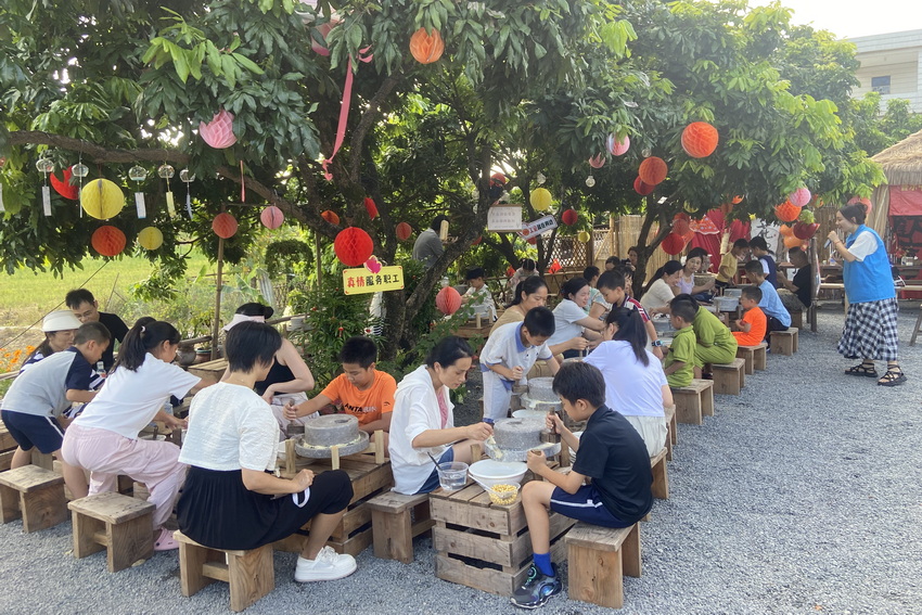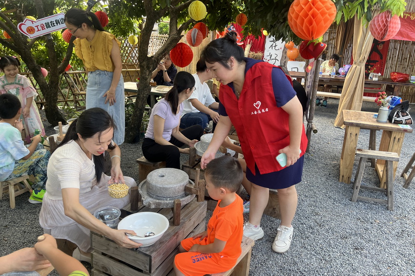 在下陈书院欢喜小院,大家学习了古法石磨豆浆的制作方法,在店家和社工的引导下,亲子互相合作,大手拉小手一点一点地放豆子、转磨盘。