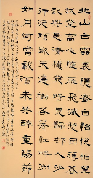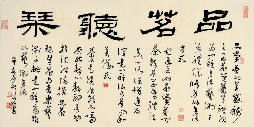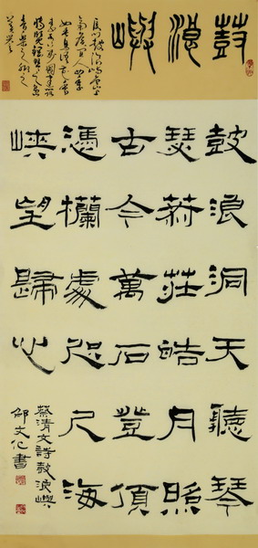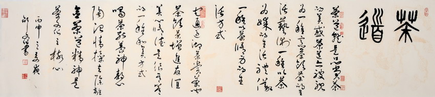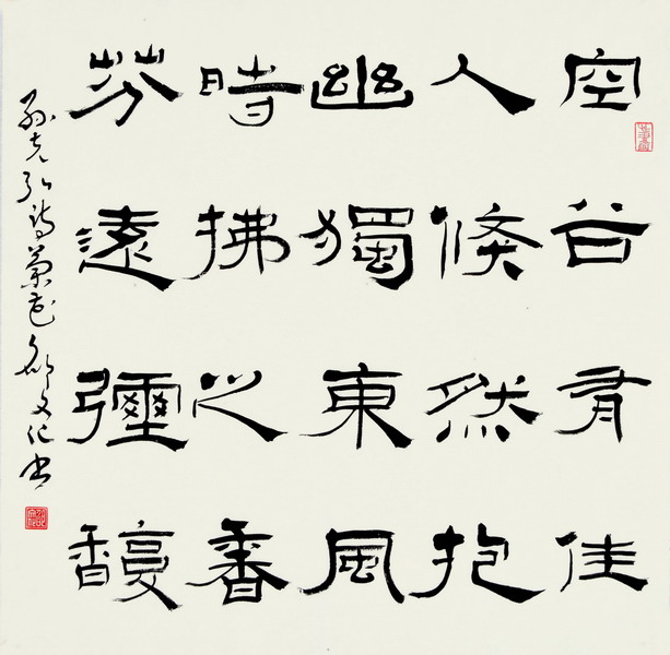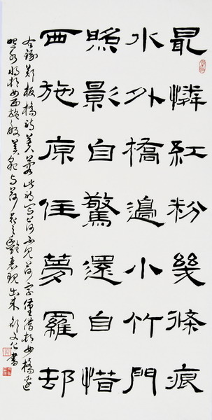 邵文化先生的书法专业弥漫着古风。他的书法作品中,不管是隶书还是草书,时常找到汉唐气象、魏晋风度的信息。他的草书主要是取法王羲之,有着魏晋风度特有的潇洒斯文、温文尔雅的平静、中和、柔美的美学境界。他的汉隶取法礼器碑、石门颂、衡方碑,造型准确,神彩飘逸。在表达上,他苦心经营书法的形式和章法,时常调整和表达展厅的视觉效果,实属难能可贵!