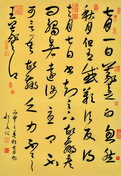 文化先生对书法艺术有着特殊的情感及至痴迷,他在繁杂公务之余,迷于书法,得其乐,造其诣。这种锲而不舍的精神始发于对书法艺术的热情。有情感、有追求、有迷恋,才能写好汉字。汉字是活生生的,有历史厚重感。文字像一个充满着思想智慧灵光的活生生的人。对汉字要用心、用情去对话、交朋友,才能成为莫逆之交。其神情动态才会像烙印一样留在心中,难以忘怀。哪怕多年不见,其音容笑貌、神情动态,拂之不去。因此,我认为文化先生对书法的痴迷,是他获得成功的一个重要的原因。