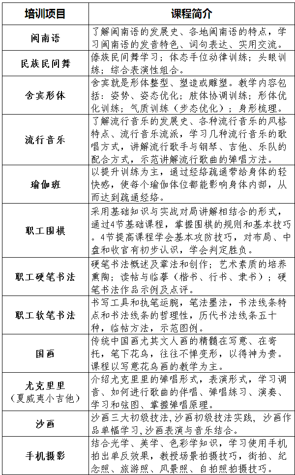 厦门市工人文化宫培训内容一览表