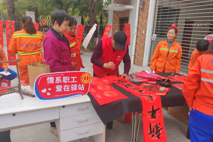 墨香四溢的写春联送福区洋溢着浓浓的年味。书法老师挥毫泼墨,将美好的新春祝福凝于一笔一画之间。一幅幅火红的春联、一个个饱满的“福”字,承载着工会对劳动者家庭的美好祝愿,也传递着传统文化中的温情与仪式感。劳动者手捧红联,笑意盈盈,吉祥如意、平安喜庆的氛围在驿站中弥漫开来。