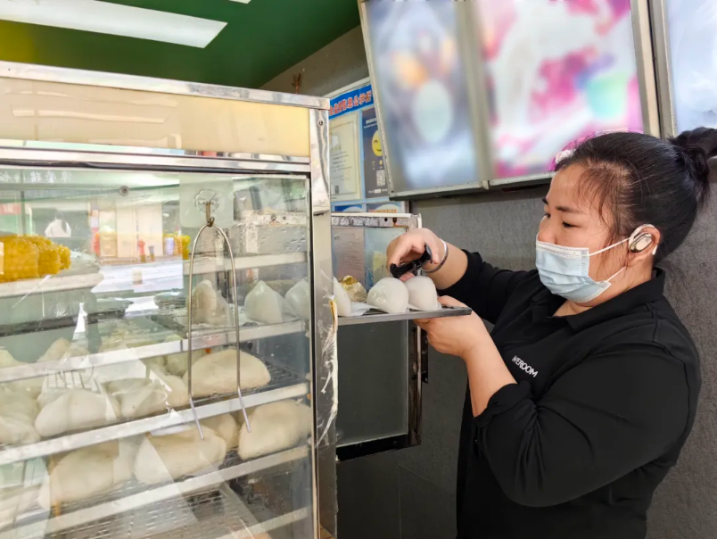 开门做生意,来者都是客。前台在上班前要整理好仪容仪表,客人用餐离开后要立即清理桌面。工作再小再平凡,细节也要做好——玉娥店长对自己对店员都是这样要求。质朴舒适的环境,接地气的服务,让这个不足15平方米的门店,成为很多人的能量补给站,在这里开启热气腾腾的一天。