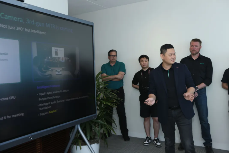 亿联网络不只做视频会议系统,还为智慧办公提供解决方案。蔡墩雄说,以前,他们理解的智慧办公是基于规则的自动化,比如,人来了自动开灯等。“但是,我们想做更智能化的产品,你来了,你是谁,喜欢什么温度,镜头一下就会聚焦,欢迎词也出来了……”他举例说。