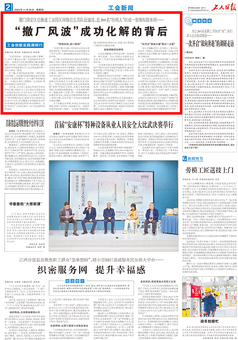 同安区总工会相关负责人表示,工业园区网格员队伍破解了以往园区劳动关系复杂、管理机制不健全、队伍力量不足、维权响应不畅、服务不及时等问题,有助于打通劳动领域基层治理“最后一公里”,提升工会的引领力、组织力、服务力。