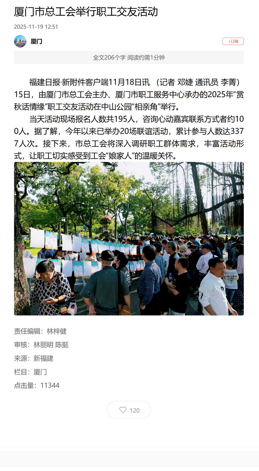 福建日报·新附件客户端11月18日讯 (记者 邓婕 通讯员 李菁)15日,由厦门市总工会主办、厦门市职工服务中心承办的2025年“赏秋话情缘”职工交友活动在中山公园“相亲角”举行。