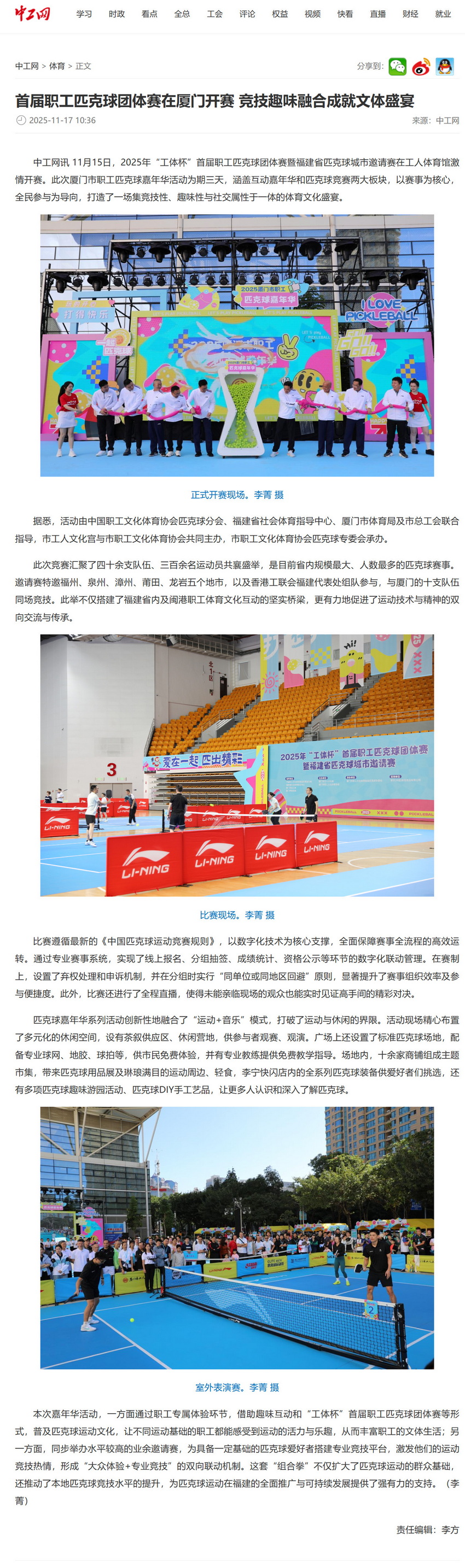 据悉,活动由中国职工文化体育协会匹克球分会、福建省社会体育指导中心、厦门市体育局及市总工会联合指导,市工人文化宫与市职工文化体育协会共同主办,市职工文化体育协会匹克球专委会承办。