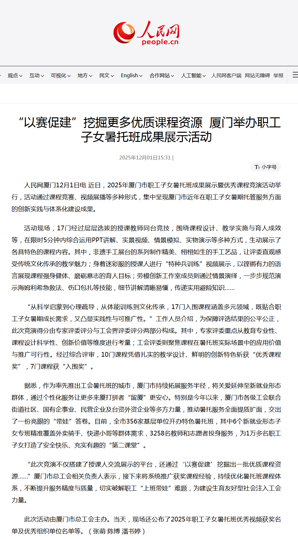 人民网厦门12月1日电 近日,2025年厦门市职工子女暑托班成果展示暨优秀课程竞演活动举行,活动通过课程竞赛、视频展播等多种形式,集中呈现厦门市近年在职工子女暑期托管服务方面的创新实践与体系化建设成果。