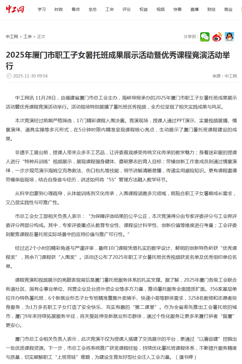 中工网讯 11月28日,由福建省厦门市总工会主办,海峡导报承办的2025年厦门市职工子女暑托班成果展示活动暨优秀课程竞演活动举行。活动现场特别展播了暑托班优秀视频,全方位呈现了相关实践成果与风采。