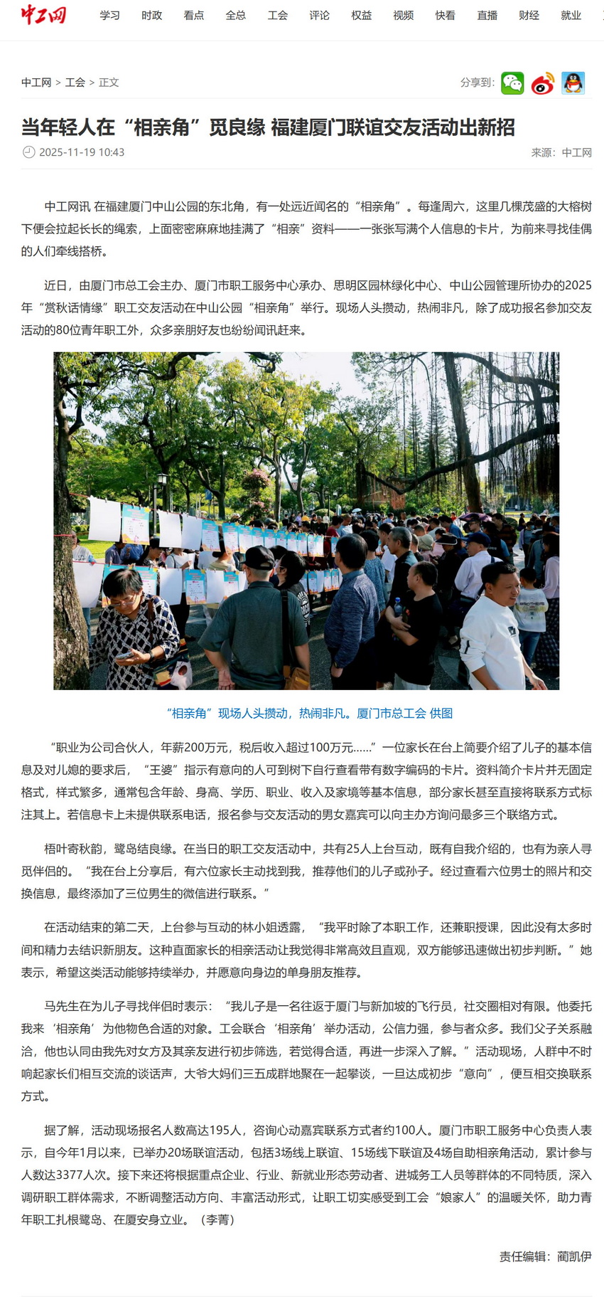 近日,由厦门市总工会主办、厦门市职工服务中心承办、思明区园林绿化中心、中山公园管理所协办的2025年“赏秋话情缘”职工交友活动在中山公园“相亲角”举行。现场人头攒动,热闹非凡,除了成功报名参加交友活动的80位青年职工外,众多亲朋好友也纷纷闻讯赶来。