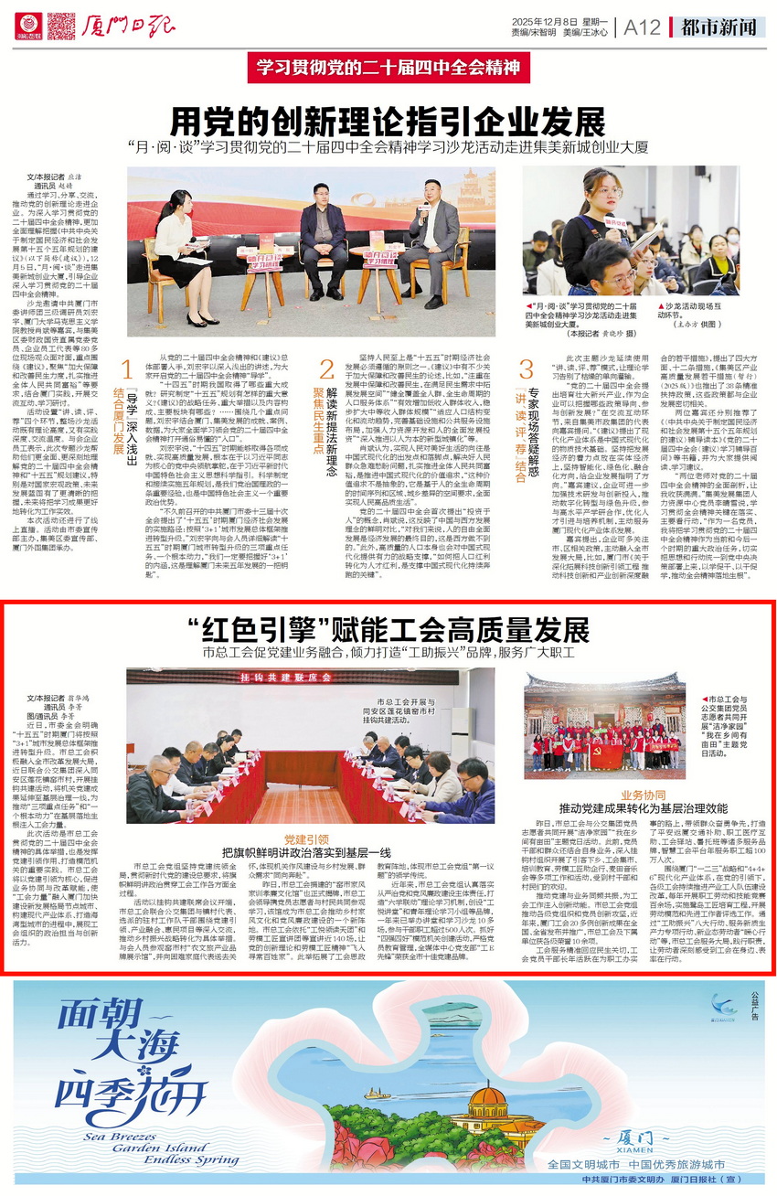推动党建与业务同频共振,为工会工作注入创新动能。市总工会党组推动各级党组织和党员创新攻坚,近年来,厦门工会20多例创新成果在全国、全省发布并推广,市总工会及下属单位获各级荣誉10余项。