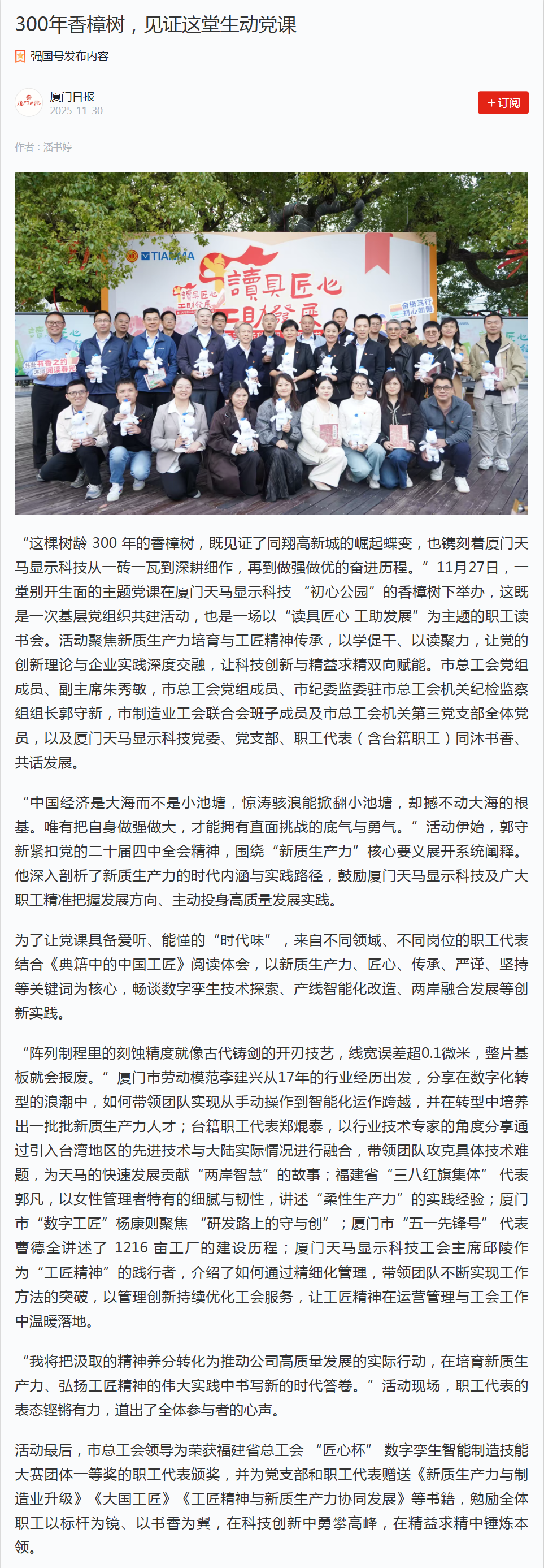 “这棵树龄 300 年的香樟树,既见证了同翔高新城的崛起蝶变,也镌刻着厦门天马显示科技从一砖一瓦到深耕细作,再到做强做优的奋进历程。”11月27日,一堂别开生面的主题党课在厦门天马显示科技 “初心公园”的香樟树下举办,这既是一次基层党组织共建活动,也是一场以“读具匠心 工助发展”为主题的职工读书会。活动聚焦新质生产力培育与工匠精神传承,以学促干、以读聚力,让党的创新理论与企业实践深度交融,让科技创新与精益求精双向赋能。市总工会党组成员、副主席朱秀敏,市总工会党组成员、市纪委监委驻市总工会机关纪检监察组组长郭守新,市制造业工会联合会班子成员及市总工会机关第三党支部全体党员,以及厦门天马显示科技党委、党支部、职工代表(含台籍职工)同沐书香、共话发展。