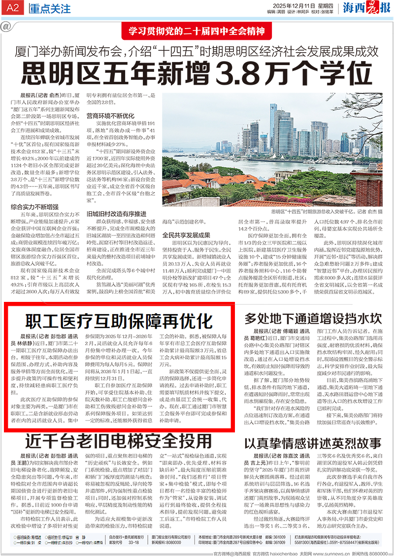 晨报讯(记者 彭怡郡 通讯员 林依静)近日,厦门市第二十一期职工医疗互助保障办法出台。相较于往年,本期活动在参保范围、办理方式、补助内容及服务举措等方面全面优化,进一步提升政策的可操作性和便利度,持续减轻患病职工医疗负担。