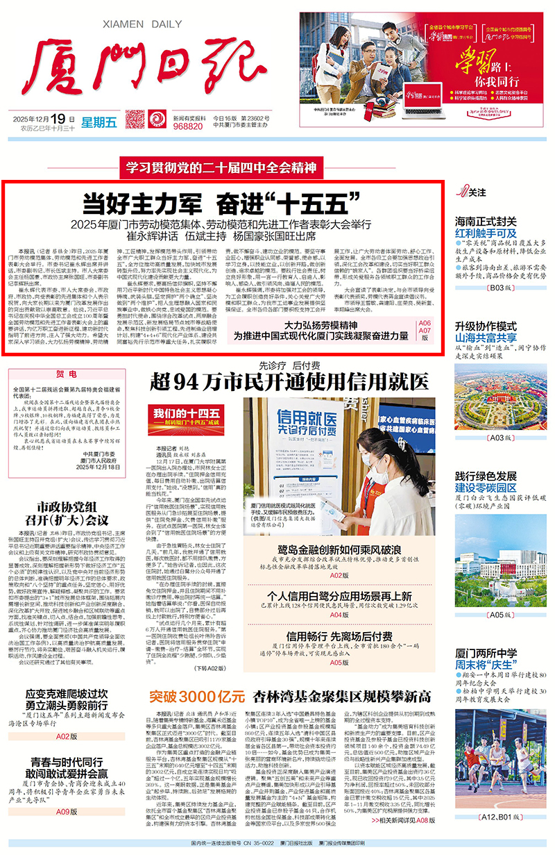 本报讯 (记者 蔡镇金)昨日,2025年厦门市劳动模范集体、劳动模范和先进工作者表彰大会举行。市委书记崔永辉出席并讲话,市委副书记、市长伍斌主持。市人大常委会主任杨国豪、市政协主席张国旺、市委副书记李辉跃出席。