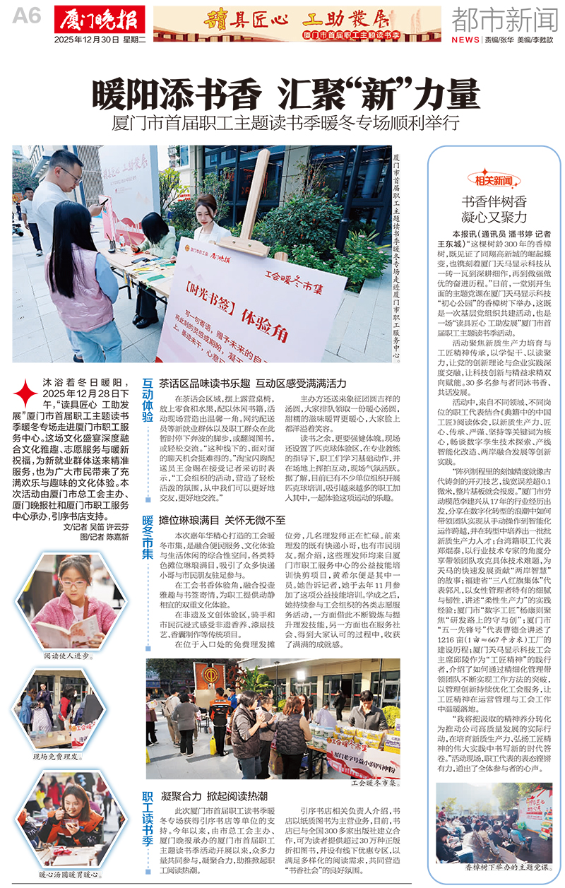 沐浴着冬日暖阳,2025年12月28日下午,“读具匠心 工助发展”厦门市首届职工主题读书季暖冬专场走进厦门市职工服务中心。这场文化盛宴深度融合文化雅趣、志愿服务与暖新祝福,为新就业群体送来精准服务,也为广大市民带来了充满欢乐与趣味的文化体验。本次活动由厦门市总工会主办、厦门晚报社和厦门市职工服务中心承办,引序书店支持。