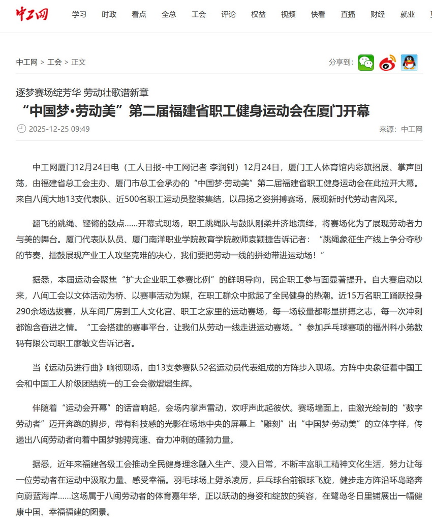 据悉,近年来福建各级工会推动全民健身理念融入生产、浸入日常,不断丰富职工精神文化生活,努力让每一位劳动者在运动中汲取力量、感受幸福。羽毛球场上劈杀凌厉,乒乓球台前银球飞旋,健步走方阵沿环岛路奔向蔚蓝海岸……这场属于八闽劳动者的体育嘉年华,正以跃动的身姿和绽放的笑容,在鹭岛冬日里铺展出一幅健康中国、幸福福建的图景。