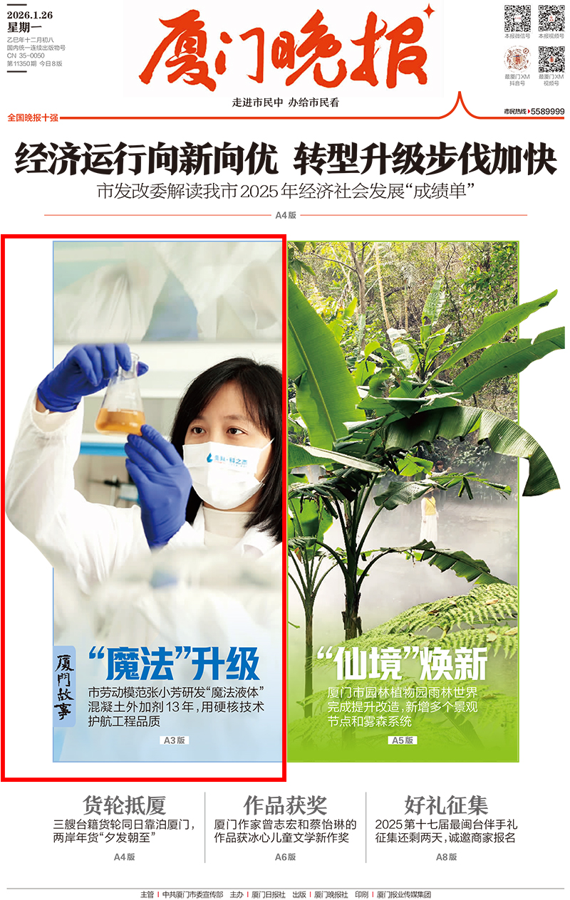 在翔安科之杰新材料集团有限公司外加剂研究所内,高级研发工程师张小芳站在一排排玻璃容器前,手中拿着一瓶“魔法液体”——高减水型聚羧酸减水剂,它能快速提高机制砂混凝土的流动性能,护航工程品质。因为作出突出贡献,前不久,张小芳获评2025年厦门市劳动模范。