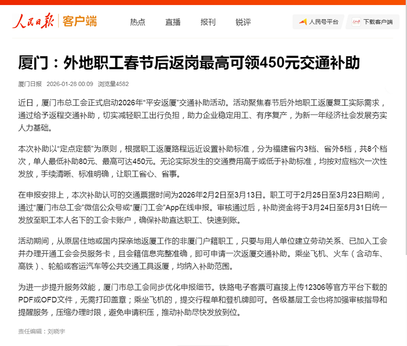 近日,厦门市总工会正式启动2026年“平安返厦”交通补助活动。活动聚焦春节后外地职工返厦复工实际需求,通过给予返程交通补助,切实减轻职工出行负担,助力企业稳定用工、有序复产,为新一年经济社会发展夯实人力基础。