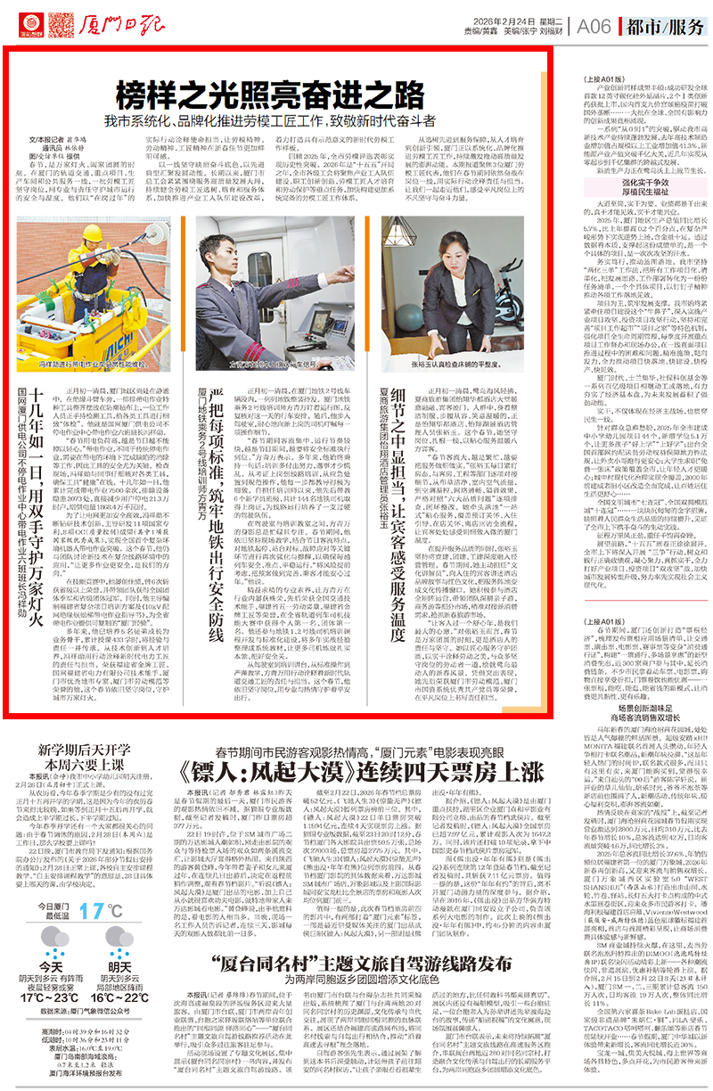 从选树先进到服务保障,从人才培育到创新引领,厦门正以系统化、品牌化推进劳模工匠工作,持续激发推动高质量发展的澎湃动能。本期报道聚焦3位厦门劳模工匠代表,他们在春节期间依然奋战在岗位一线,用实际行动诠释责任与担当。让我们一起走近他们,感受平凡岗位上的不凡坚守与奋斗力量。