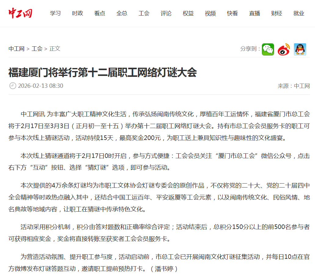 中工网讯 为丰富广大职工精神文化生活,传承弘扬闽南传统文化,厚植百年工运情怀,福建省厦门市总工会将于2月17日至3月3日(正月初一至十五)举办第十二届职工网络灯谜大会。持有市总工会会员服务卡的职工可参与本次线上猜谜活动,活动持续15天,最高奖金200元,为职工送上兼具知识性与趣味性的文化盛宴。