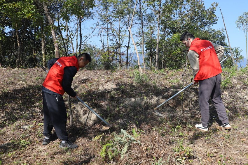 集美坂头林场内草木萌发、生机盎然,却有不少杂草借着春日暖阳肆意生长,抢夺苗木的养分与水分,影响林木健康发育。活动现场,志愿者们身着红马甲,热情高涨、精神抖擞,在林场技术人员的专业指导下,快速掌握除草抚育的技巧与要点——既要彻底清除苗木周边杂草,也要翻除草根防止复长,同时精准避开苗木根系避免损伤。大家两人一组、分工协作,有的手持镰刀割除高处杂草,有的挥起锄头翻挖草根、平整土地,有的仔细清理树穴周边杂枝,各环节衔接有序、配合默契。锄头挥舞、镰刀起落,志愿者们忙碌的身影遍布抚育地块,汗水浸湿衣衫却丝毫未减劳动热情,欢声笑语与劳动声响交织,汇成一曲生动的护绿乐章。