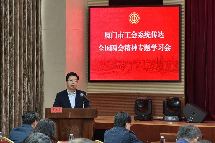 3月20日上午市总工会召开党组扩大会议暨党组理论学习中心组扩大会议集中学习传达2026年全国两会精神。全国人大代表、全国劳动模范,厦门集装箱码头集团有限公司工会主席冯鸿昌传达全国两会精神。厦门市总工会党组书记、副主席邱武伟主持会议并讲话。