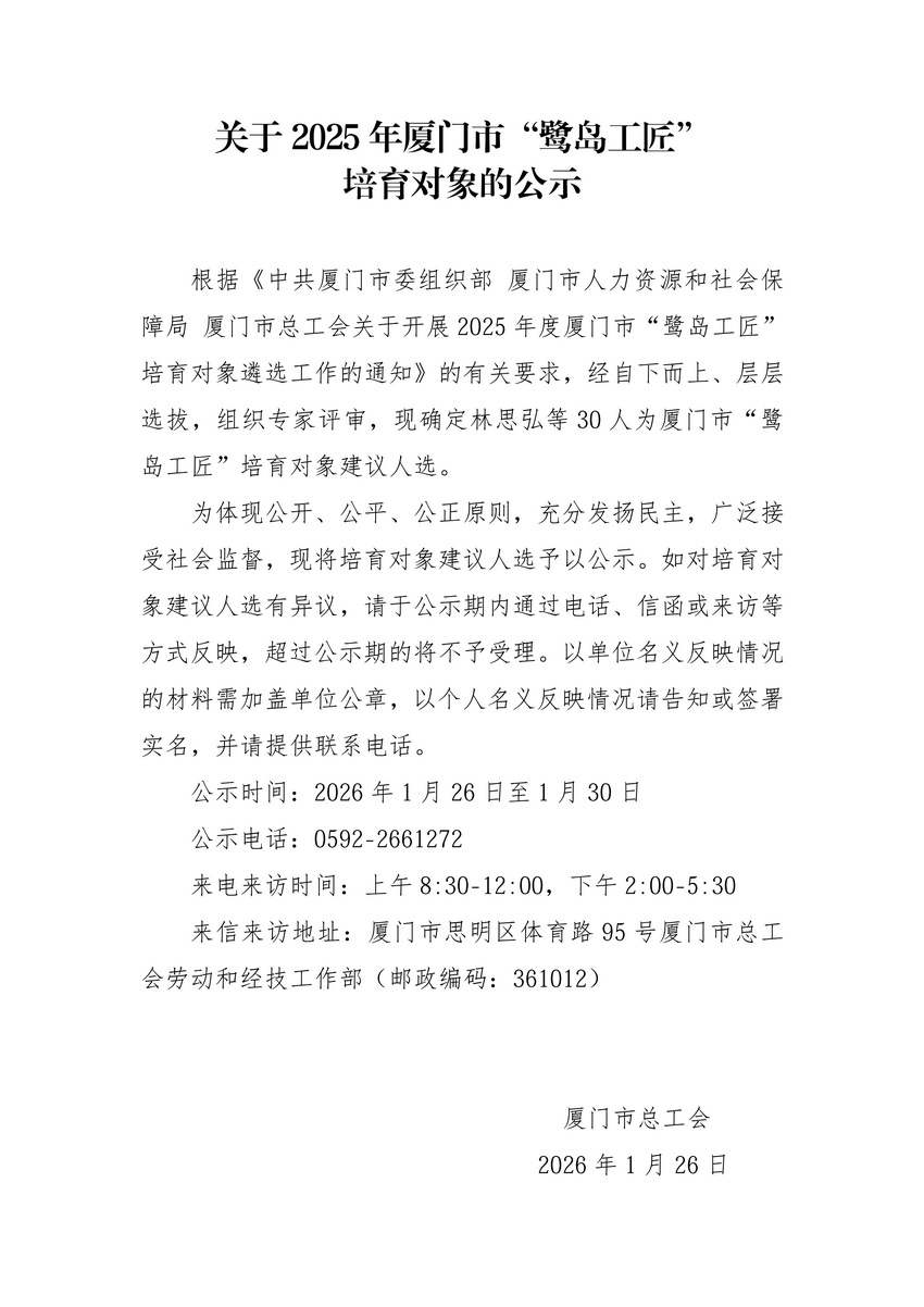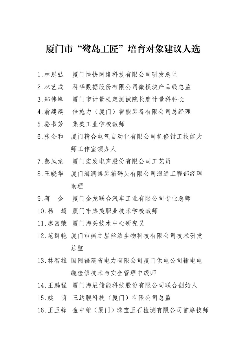 关于2025年厦门市“鹭岛工匠”培育对象的公示