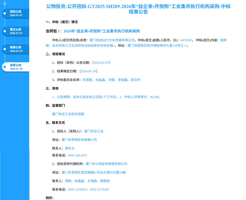 公物投资-公开招标-GT2025-SH209-2026年“益企来•月悦购”工会集市执行机构采购-中标结果公告