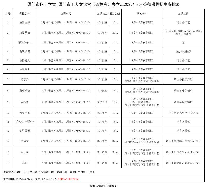 1.3月25日20点微信平台抢课(关注厦门市总工会公众号)名额有限,先报先得。