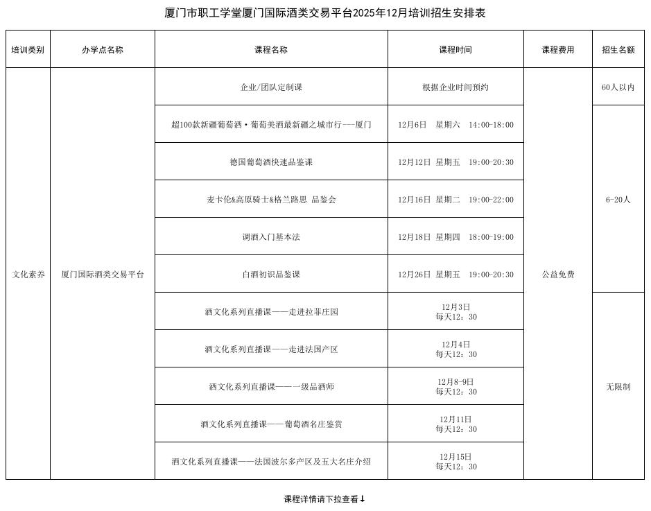 6.招生对象、条件及名额:厦门市在职在岗职工均可参与,课程人数限6-20人/期,请勿携带餐食进入。