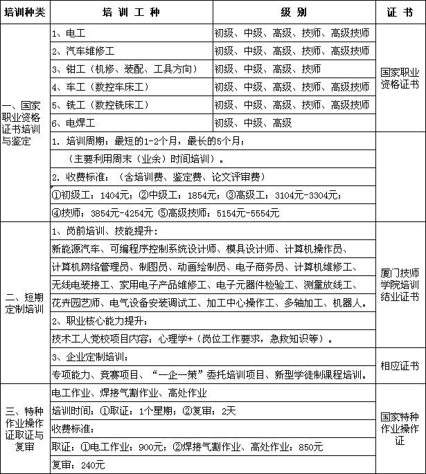 厦门技师学院培训内容一览表